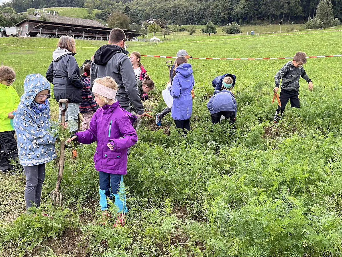Am 13. September verbrachten die Schülerinnen und Schüler der 3. Klasse aus Leibstadt und der 4. Klasse aus Full-Reuenthal einen erlebnisreichen Tag am Landwirtschaftlichen Zentrum Liebegg. An verschiedenen Posten zu den Themen vom Getreide zum Brot, Milchprodukte, Foodwaste und Obst lernten die Kinder beispielsweise, dass eine Milchkuh pro Tag ca. 35l Milch gibt, in welchen Monaten Erdbeeren geerntet werden können oder dass es für ein 750g-Brot eine Getreidefläche von 80cm x 100cm braucht. Beim Posten Rüebli graben durften sie selber Hand anlegen und ihre Ernte nachhause nehmen.