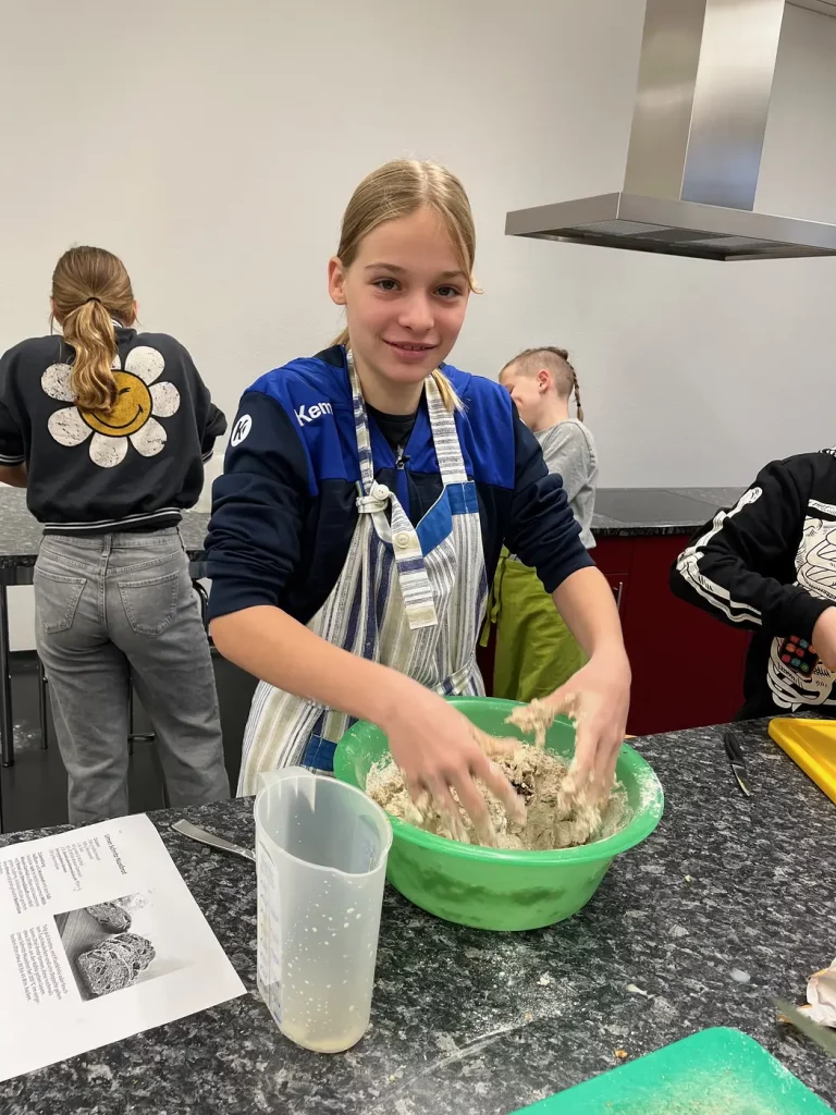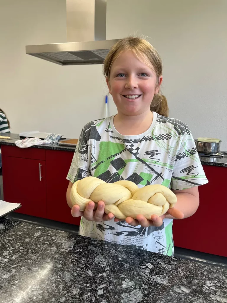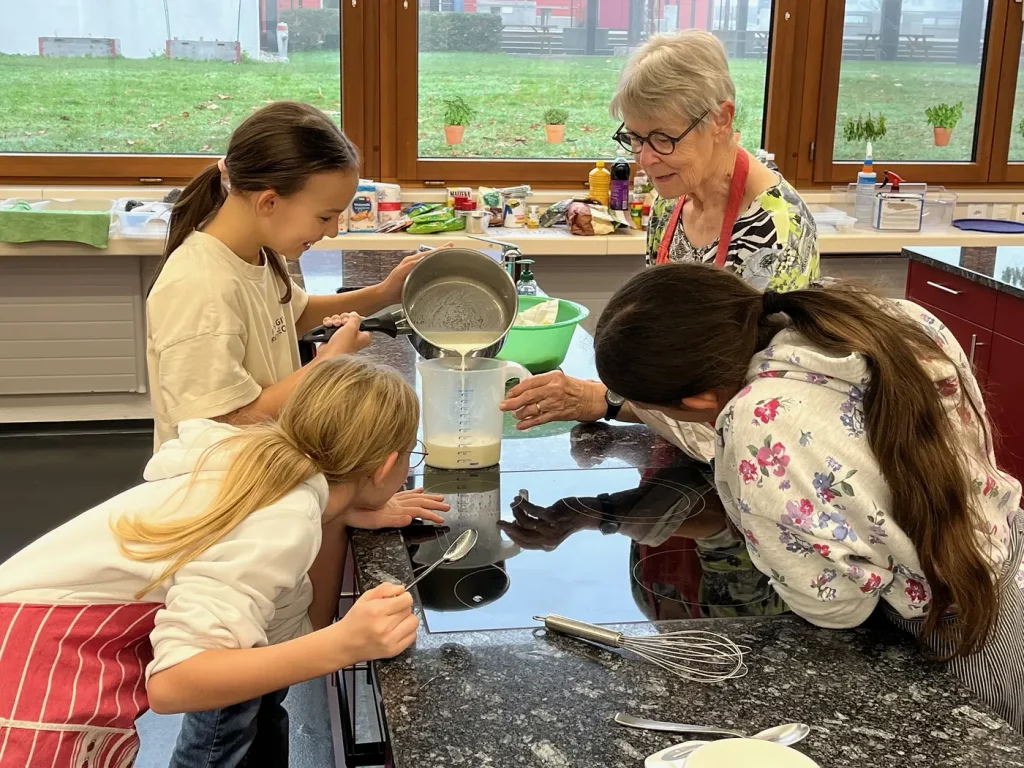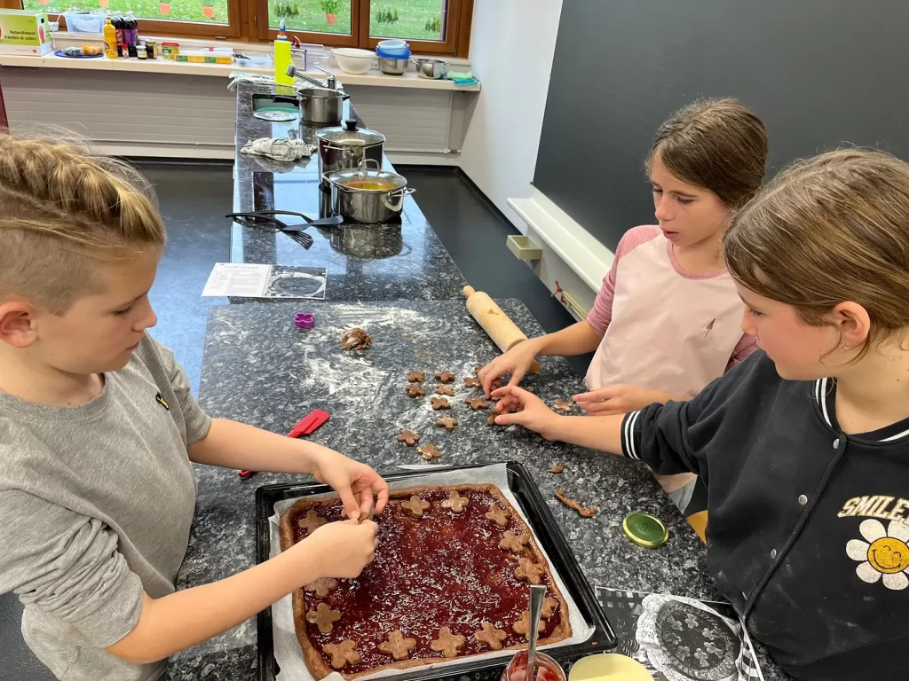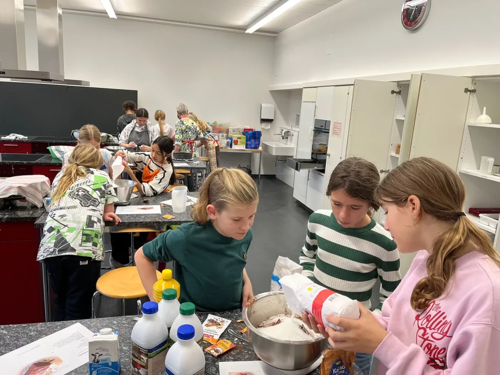 An zwei Tagen sind wir mit dem Fahrrad nach Leibstadt gefahren. Wir haben Schweizer Spezialitäten gebacken. Wir haben Lebkuchen, St.Galler Klostertorte, Thurgauer Apfelkuchen und verschiedene Brote gebacken und zum Abschluss Raclette gegessen. Ich habe mit meiner Gruppe Rüeblitorte gebacken.