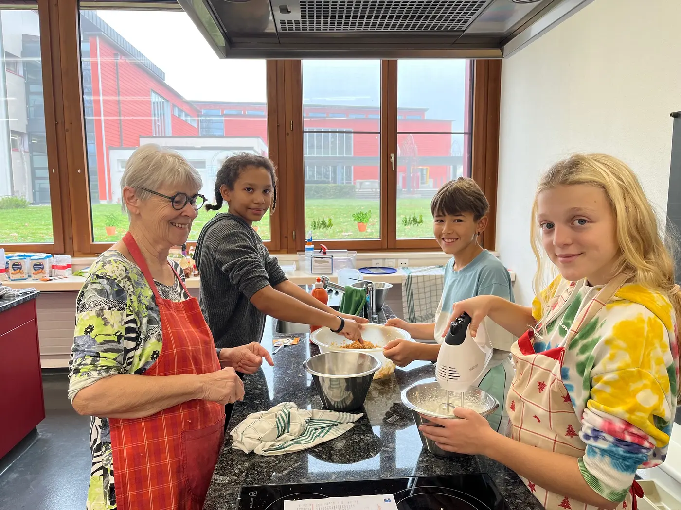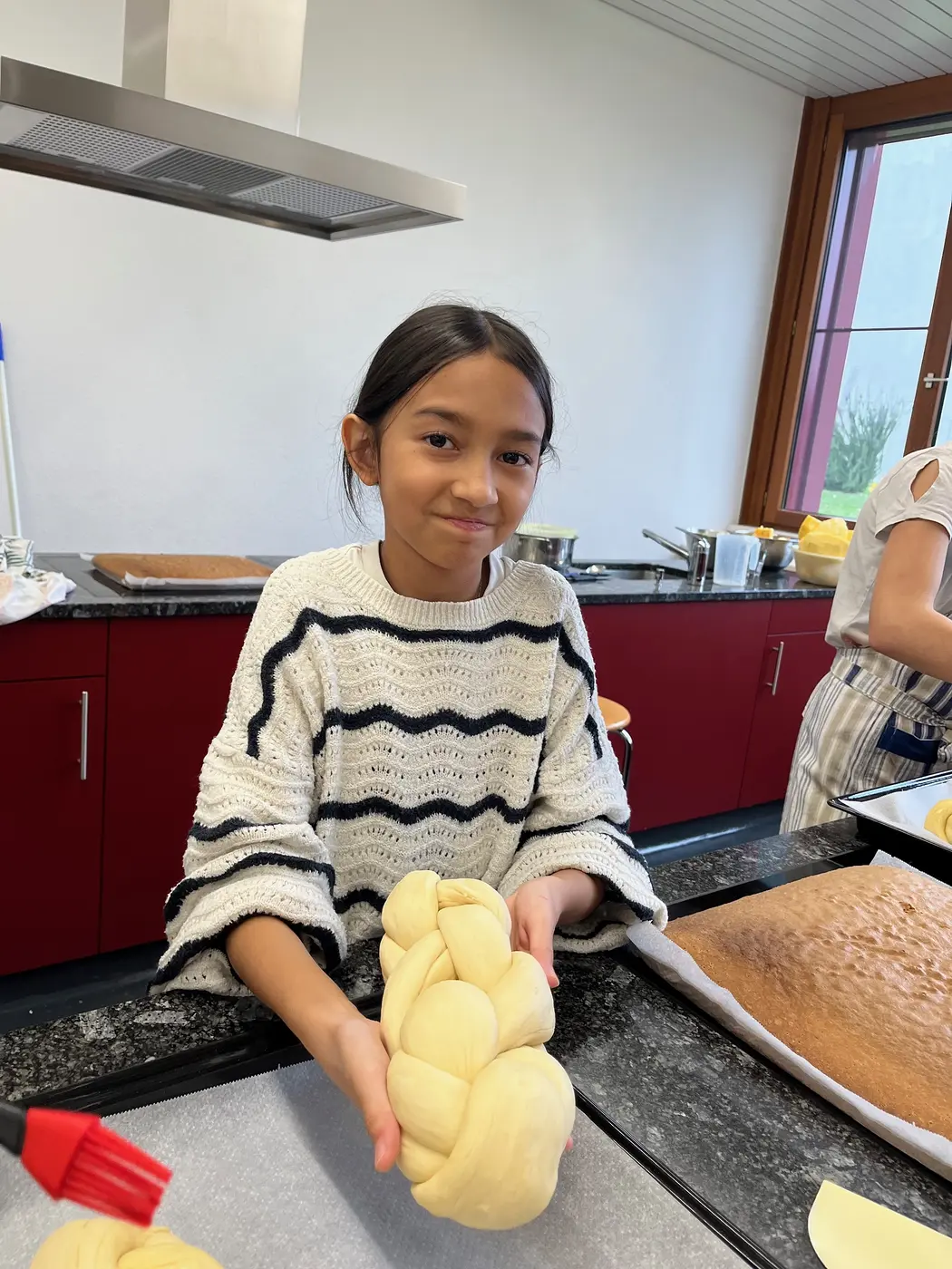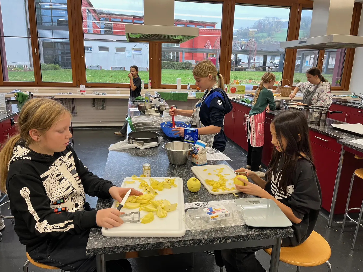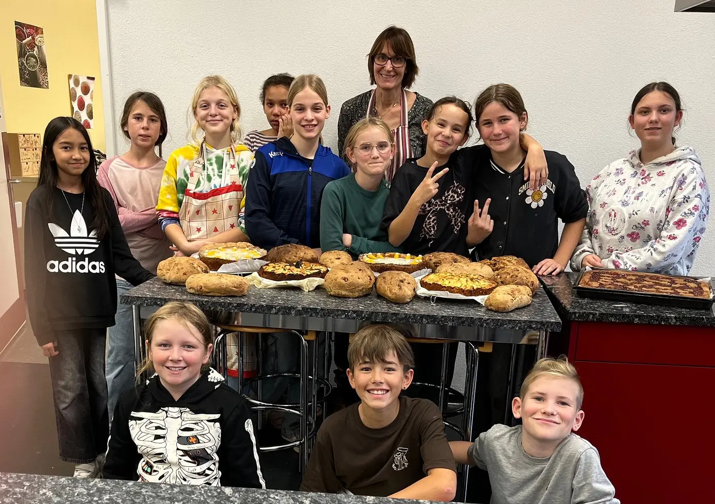 An zwei Tagen sind wir mit dem Fahrrad nach Leibstadt gefahren. Wir haben Schweizer Spezialitäten gebacken. Wir haben Lebkuchen, St.Galler Klostertorte, Thurgauer Apfelkuchen und verschiedene Brote gebacken und zum Abschluss Raclette gegessen. Ich habe mit meiner Gruppe Rüeblitorte gebacken.