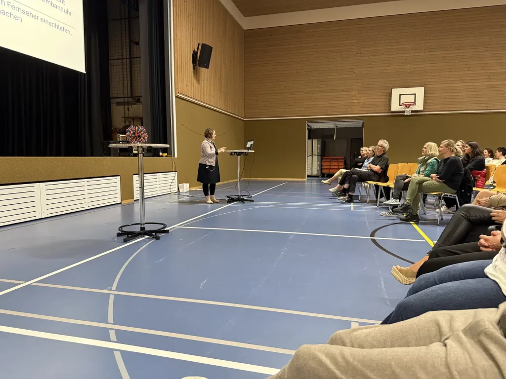 Die Eltern erhielten dabei überraschende Einblicke, praktische Tipps und erlebten so manchen Aha-Moment. In einer Austauschrunde konnten sich die Teilnehmenden intensiv über die Bedeutung von Schlaf und Bewegung für das Lernen austauschen. Auch Bewegung kam an diesem Abend nicht zu kurz: In einer kurzen Aktivpause durften die Eltern gleich selbst erfahren, wie wichtig Bewegung im Schulalltag ist – sei es im Unterricht oder in den Pausen.