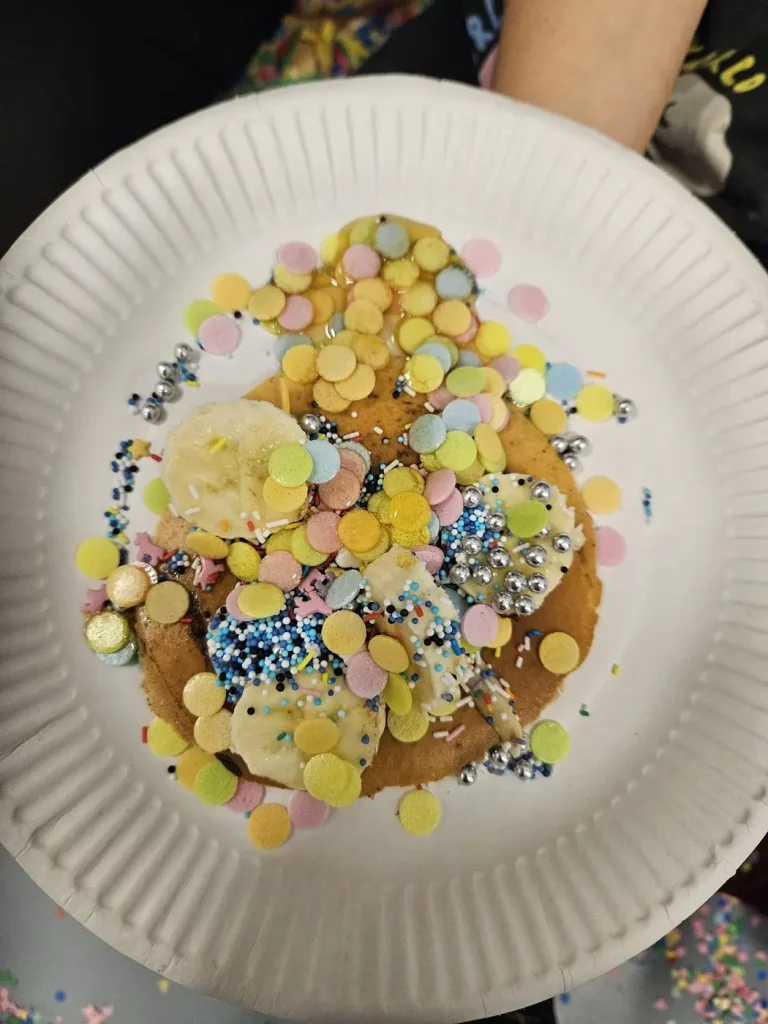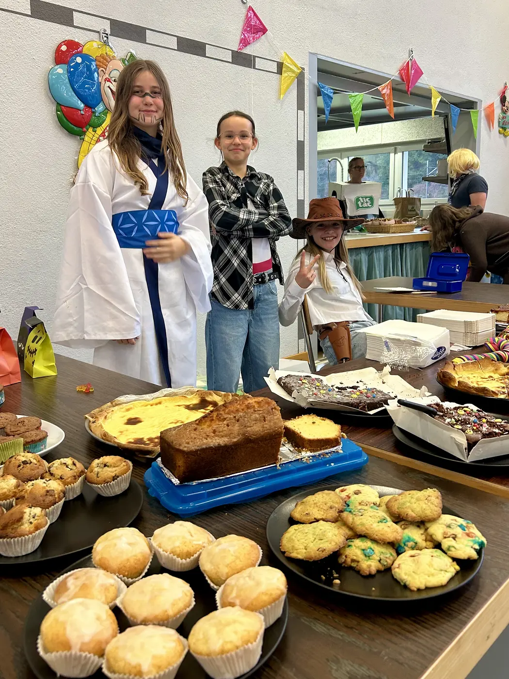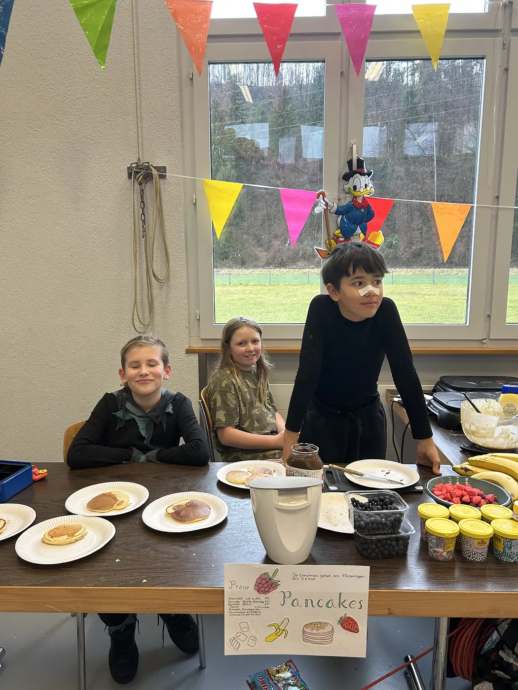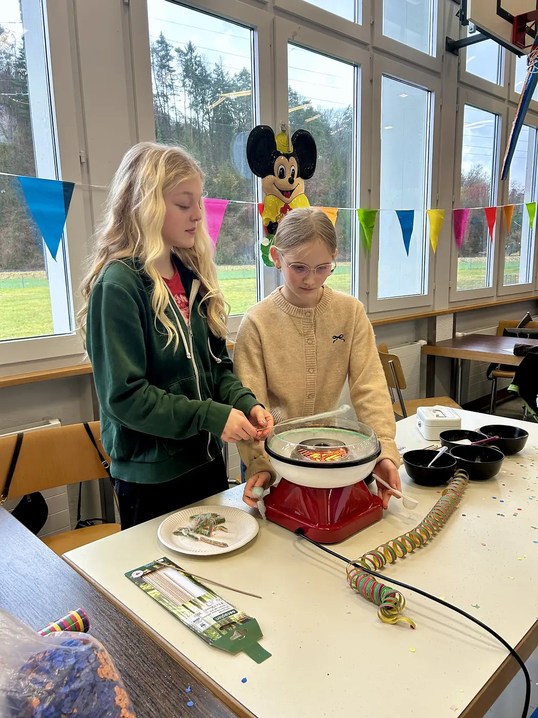 Auch kulinarisch blieben keine Wünsche offen. Die 6. Klasse legte sich für ihr bevorstehendes Klassenlager mächtig ins Zeug und verwöhnte die Gäste mit feinen Kuchen, frisch gebackenen Pancakes und süsser Zuckerwatte. Zusätzlich lockte eine liebevoll eingerichtete Beauty-Ecke mit Glitzertattoos und buntem Nagellack. Ein weiteres Highlight: Jedes Kind erhielt ein gratis Hot Dog.