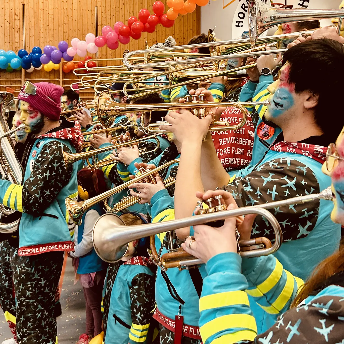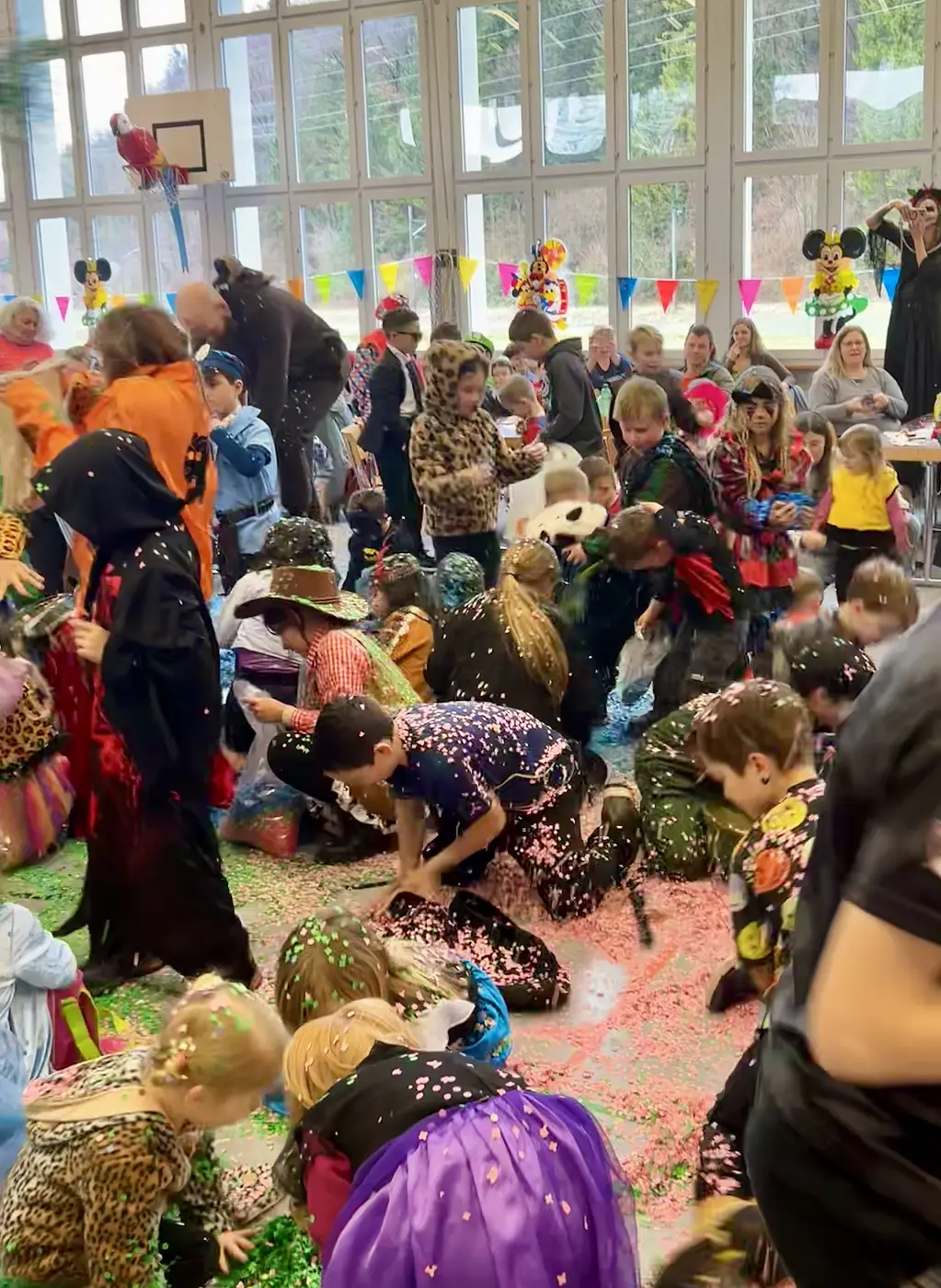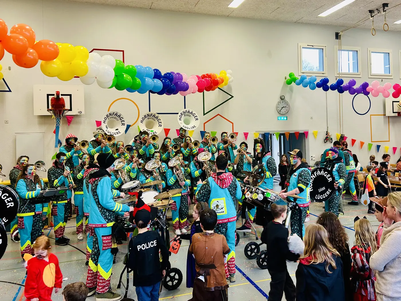 Für musikalische Highlights sorgte die Guggenmusig Hornfääger, die mit ihrem lauten und mitreissenden Konzert die Halle zum Beben brachte. Es wurde kräftig getanzt, gehüpft und gelacht. Ein ganz besonderer Höhepunkt war die mit Spannung erwartete Konfettischlacht: Kaum eröffnet, waren die drei grossen Säcke Konfetti innert kürzester Zeit in der ganzen Halle – und auf den Köpfen aller Anwesenden – verteilt.
